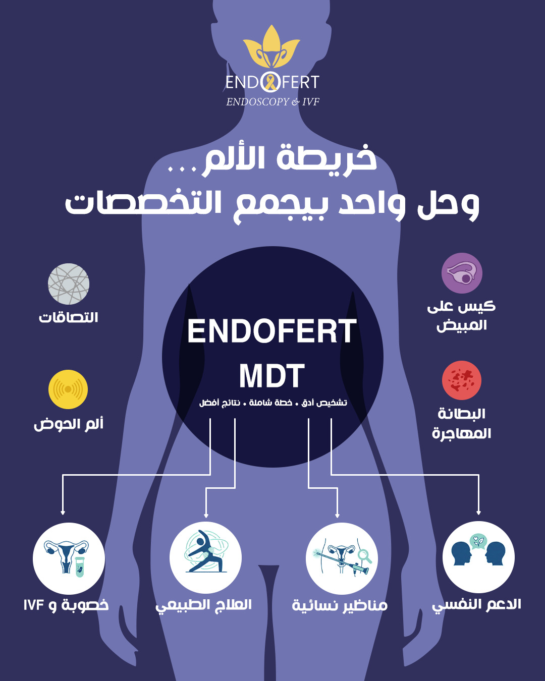 نظراً لتعدد أسباب ألم الحوض المزمن، يُعد تشخيصه وعلاجه تحديًا إذ قد ينجم ألم الحوض المزمن عن حالات نسائية، أو هضمية، أو بولية، أو عضلية هيكلية، أو نفسية. لذا، يُنصح بالتوجه إلى مركز اندوفيرت متعدد التخصصات Multidisciplinary Team (MDT).